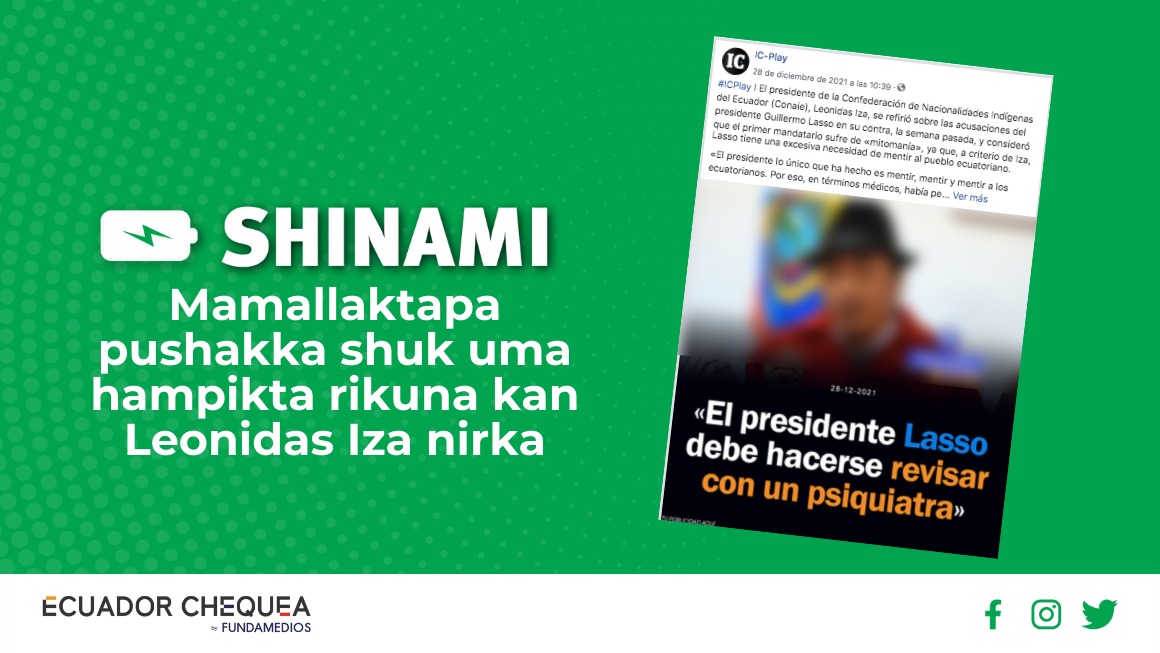 Chaykunamanta Iza shuk tapuykutichipi Sonorama uyachikantapi rimarka. Conaiepa pushakka 2019 watapi hatariy tiyashkamanta rimarka. Contraloria rupachishkamanta yankamanta huchachinakun imashina Lasso nikun nirka. “Mamallakta pushak, llullaytalla llullashkanki, ecuador runakunaman llullaytalla llullashkanki. Hampimanta rikushpaka uma unkuypa hampikta rikuna mana kashpaka shuk hampikta. Kikinpa ayllukuna llakiyarinkami shina llullaysapamanta”.