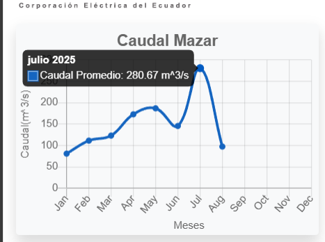 Así, este embalse de Mazar, sigue enfrentando una fuerte tendencia a la baja en su caudal, según los datos oficiales más recientes de la Corporación Eléctrica del Ecuador, Celec: el promedio del flujo de agua se ubica hoy en 33,67 metros cúbicos por segundo (m³/s), muy lejos del máximo anual de 280,67 m³/s registrado en julio. En cinco meses, la reducción alcanza el 88%.