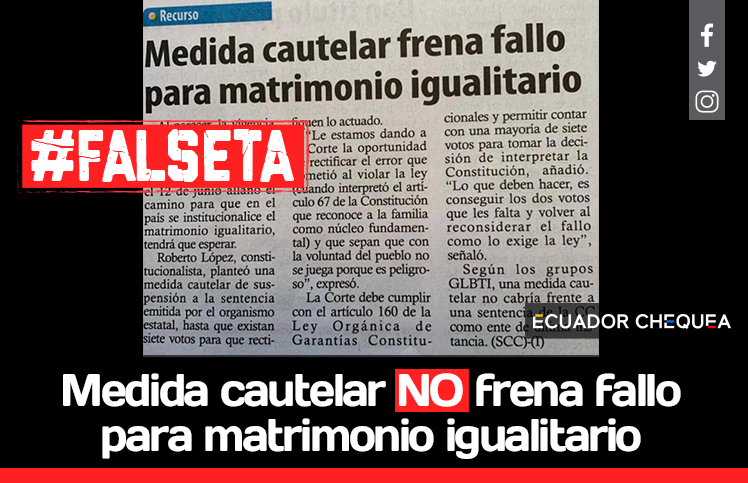 A través de mensajes de WhatsApp circuló una fotografía de una nota en cuyo titular se afirma que «Medida cautelar frena fallo para matrimonio igualitario». Sin embargo, el primer párrafo del texto pone en duda el titular al mencionar que «Al parecer (el matrimonio civil igualitario)… tendrá que esperar». En la nota se recogen declaraciones del constitucionalista Roberto López, el cual planteó una medida cautelar de suspensión a la sentencia emitida por la Corte Constitucional hasta que existan 7 votos.