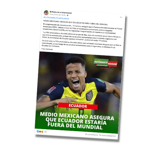 Con esta información, una página de Facebook publicó que un medio mexicano aseguró que Ecuador estaría fuera del mundial. La información es falsa. TV Azteca Deportes emitió información, hace un par de días, confirmando la denuncia de Chile, pero la FIFA difundió hoy su fallo a favor de Ecuador y a través de un comunicado señaló que se cerró el procedimiento.