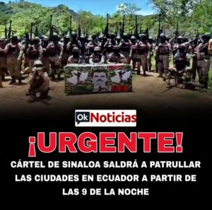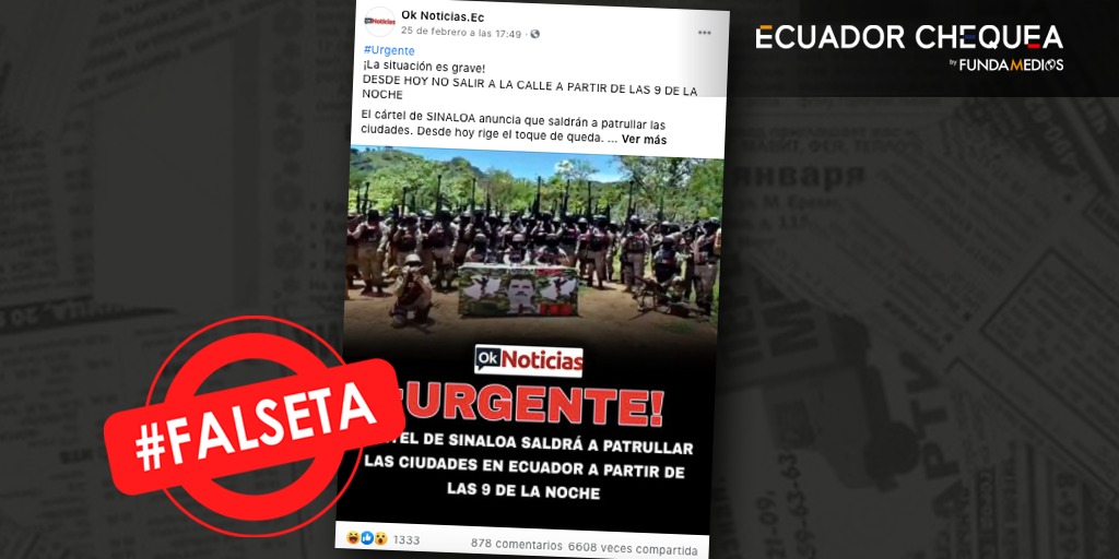 Una imagen de supuestos guerrilleros junto con un mensaje de alarma que dice: “cártel de Sinaloa saldrá a patrullar las ciudades en Ecuador, a partir de las 9 de la noche” circulan en un post desde la cuenta de Facebook OK noticias.Ec, es falso.
