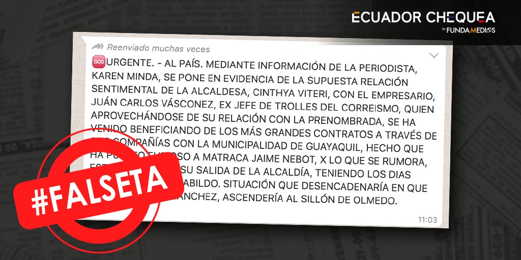 Un mensaje “reenviado muchas veces” mediante WhatsApp indica que la periodista ecuatoriana Karen Minda habría revelado información falsa sobre una supuesta relación sentimental de la alcaldesa Cinthya Viteri con el empresario Juan Carlos Vásconez y supuestos casos de corrupción en el Municipio de Guayaquil. Karen Minda confirmó a Ecuador Chequea que el mensaje es falso y que ella no ha revelado ese tipo de información.