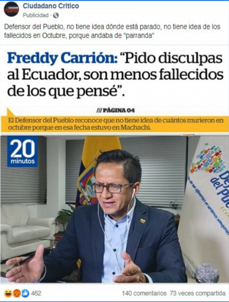 Los mensajes engañosos, publicados desde el 7 febrero de 2020, se enfocan en el expresidente Rafael Correa, la exasambleísta Lourdes Tibán y el Defensor del Pueblo, Freddy Carrión. En ocasiones, el contenido incluso se pautó a través de la red social. Es decir, se pagó para amplificar su impacto entre los usuarios.