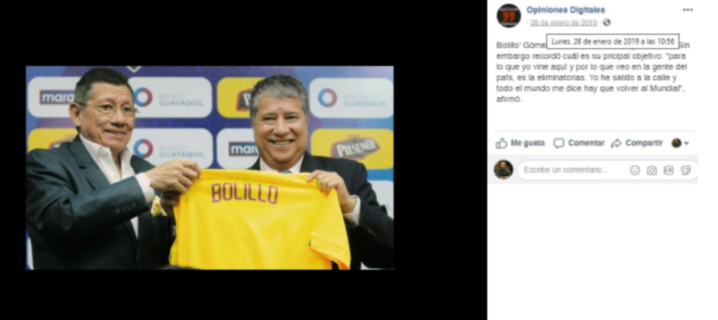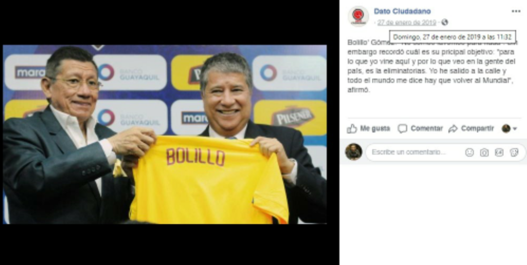 Se trata de contenido relacionado a la contratación de Hernán Darío, Bolillo, Gómez como director técnico de la Selección Ecuatoriana de Fúrbol. La misma fotografía y descripción se replicaron en los demás perfiles detectados. Cuatro lo hicieron el mismo día, a la misma hora.