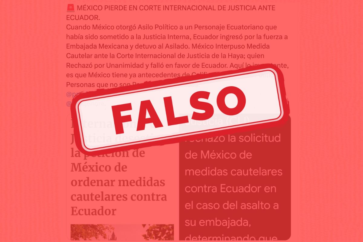 En redes sociales circula un tuit del analista político Luis Alberto Mendoza Zúñiga que asegura que México “perdió” ante Ecuador en la Corte Internacional de Justicia (CIJ). La afirmación es falsa. El tribunal de La Haya no ha fallado aún sobre el fondo del caso presentado por México, sino que solo rechazó medidas cautelares por no considerarlas necesarias. Esto no representa una victoria judicial de Ecuador ni una derrota de México.