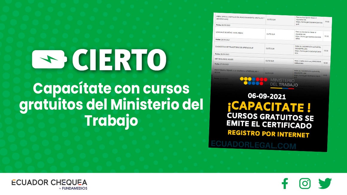 Desde este 6 de septiembre se difundió en la cuenta de Facebook Ecuador Legal una invitación del Ministerio del Trabajo sobre ofertas gratuitas de capacitación en distintas áreas, cuyo certificado sería emitido por el Ministerio. La oferta de capacitación es real, y la citada cuenta de Facebook redifunde esa información.