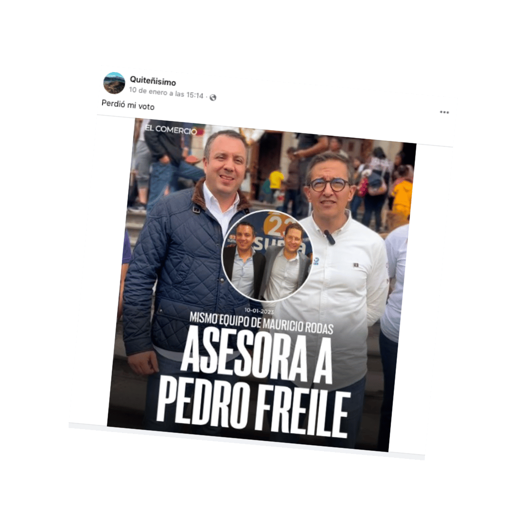 En la composición de la publicación aparece una foto donde se observa a Pedro Freile junto al expresidenciable Guillermo Celi, quien es dirigente de SUMA. En una fotografía más pequeña se ve, en esta ocasión, a Celi junto a Rodas. Sobre ellos, aparece la supuesta información, en letras grandes. “Mismo equipo de Mauricio Rodas asesora a Pedro Freile”, dice el texto en la imagen.