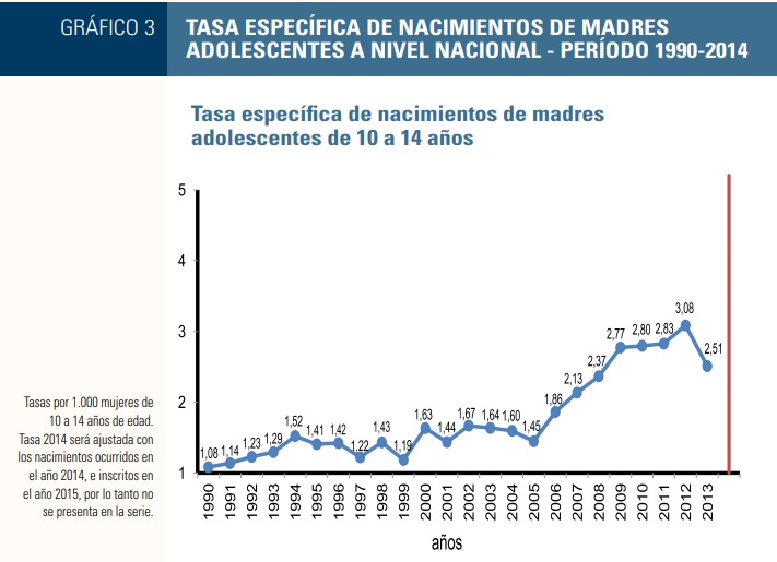 Virginia Gómez de la Torre, Paula Castello y María Rosa Cevallos, en su estudio ‘Vidas Robadas – Entre la omisión y la premeditación: situación de la maternidad forzada en niñas del Ecuador’, exponen que en Ecuador «el embarazo en menores de 14 años es un grave problema de salud pública, la tendencia del porcentaje de partos de niñas de 10 a 14 años se ha incrementado desde 2002 hasta 2010 en aproximadamente un 78,1%, lo que quiere decir que, en 2010, un total de 3.864 niñas menores de 14 años fueron madres producto de la violencia sexual«.