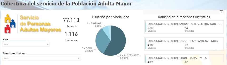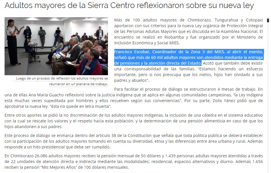 Las cifras sobre la cobertura de adultos mayores no parecen estar del todo claras al interior del MIES. Así, durante un encuentro realizado el 22 de mayo en Riombamba con más de 100 adultos mayores de Chimborazo, Tungurahua y Cotopaxi, Francisco Escobar, Coordinador de la Zona 3 del MIES, señaló que más de 60.000 adultos mayores son atendidos mediante la entrega de pensiones y la atención directa del Estado.