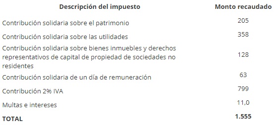 El SRI, en su informe de resultados de la Ley Orgánica de Solidaridad y de Corresponsabilidad Ciudadana, cifró en USD 2.955 millones el monto total destinado a las zonas afectadas. Del total, USD 1.663 millones corresponden exclusivamente a la recaudación de contribuciones solidarias.Además, de acuerdo a esta institución la aplicación de la Ley de Solidaridad permitió la creación de 63.412 negocios adicionales en las zonas de Manabí y Esmeraldas.