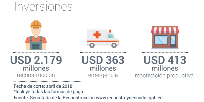 Por su parte, El Comité de Reconstrucción y Reactivación Económica, detalló que hasta el 30 de junio del 2017 los fondos recaudados por la Ley de Solidaridad y Corresponsabilidad Ciudadana superaron los $1.555 millones por contribuciones solidarias. Los fondos recaudados habrían permitido ejecutar proyectos para la construcción de viviendas, reconstrucción de infraestructura educativa, hospitalaria, eléctrica, agua potable y saneamiento ambiental, vialidad, regeneración urbana de las ciudades devastadas, obras y créditos para la reactivación productiva, entre otros.
