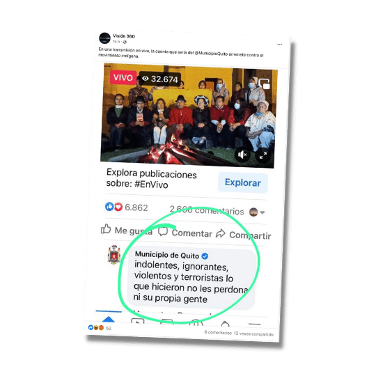 Una publicación en Facebook asegura que, en esa transmisión en vivo, la cuenta del Municipio de Quito arremetió contra el movimiento indígena. En la imagen se ve un supuesto comentario que dice: “Indolentes, ignorantes, violentos y terroristas, lo que hicieron no les perdona ni su propia gente”. El comentario se habría publicado desde la cuenta del Municipio de la capital. La información es falsa.