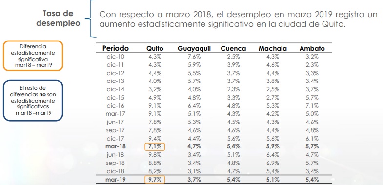 Nebot aportó un dato correcto al mencionar que el índice de desempleo en el Puerto Principal es de 3,7%, el más bajo registrado a escala nacional. Pero, de acuerdo al Instituto Ecuatoriano de Estadísticas y Censos (INEC), en su Encuesta Nacional de Empleo, Desempleo, y Subempleo de marzo de 2019, la única ciudad en la que creció el indicador de desempleo fue Quito. En contraposición, en Guayaquil, Cuenca, Machala y Ambato los índices de desempleo se mantiene o registran un descenso.