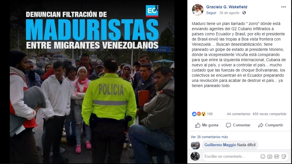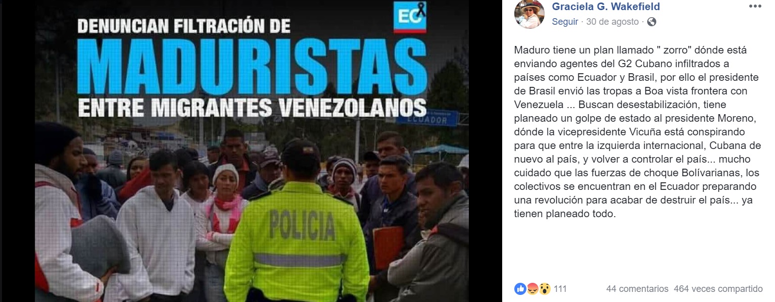 Desde el 30 de agosto circula en Facebook y Twitter una publicación en que se afirma que el presidente venezolano Nicolás Maduro, representando la «izquierda internacional», tiene planeado un golpe de Estado en contra de su homólogo Lenín Moreno. Una evidencia de este hecho sería la movilización de tropas por parte del Gobierno brasileño a la zona fronteriza de Boa Vista. Además, este contenido enfatizó en que colectivos bolivarianos se encuentran en Ecuador preparando una revolución para «acabar de destruir al país».