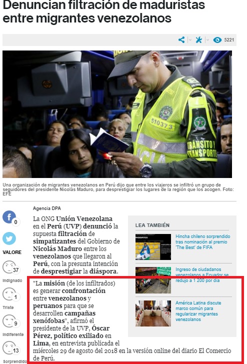 «La misión (de los infiltrados) es generar confrontación entre venezolanos y peruanos para que se desarrollen campañas xenófobas», afirmó el presidente de la Unión Venezolana en el Perú, Óscar Pérez, político exiliado en Lima. Las declaraciones las recogió El Comercio de Perú, el 30 de agosto.
