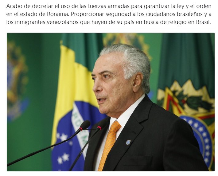 Acabei de decretar o emprego das Forças Armadas para a Garantia da Lei e da Ordem, no estado de Roraima. Para oferecer segurança aos cidadãos brasileiros e aos imigrantes venezuelanos que fogem de seu país em busca de refúgio no Brasil. pic.twitter.com/b0MRwN7C4Z