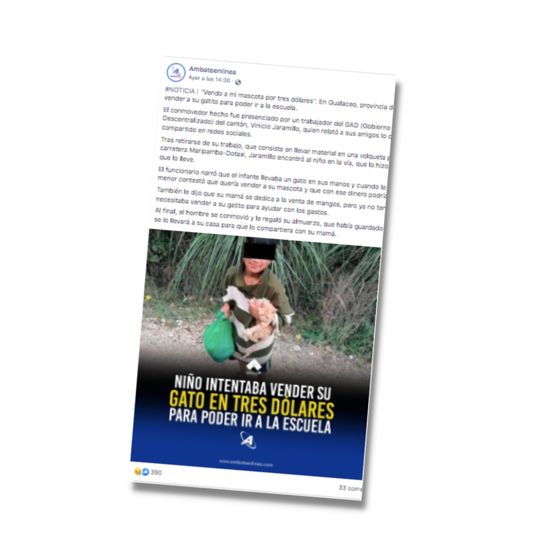 En Gualaceo, Azuay, un niño intentaba vender a su gatito para poder ir a la escuela. El hecho fue hecho público por Vinicio Jaramillo, trabajador del Municipio de ese cantón, quien relató a sus amigos lo ocurrido, y luego fue compartido en redes sociales.