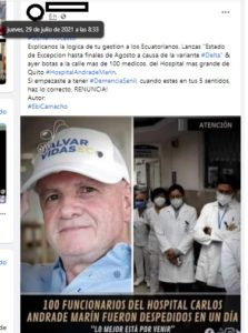 El 28 de julio se difundió información en cuentas personales de Facebook donde se le hace un llamado al Presidente Guillermo Lasso porque “lanza estado de excepción hasta finales de agosto y ayer (27 julio) botó a la calle a más de 100 médicos” del hospital Carlos Andrade Marín de Quito en un día. La información es falsa, porque el estado de excepción solo se aplicará en el cantón Guayaquil y la provincia de El Oro debido a la presencia de la variante Delta del COVID-19. Además, el hospital Carlos Andrade Marín de Quito no ha despedido a médicos.