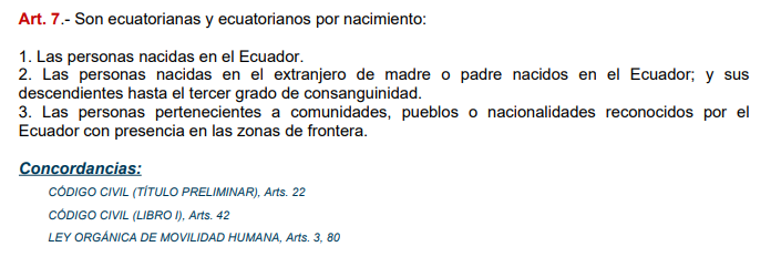 La Constitución del Ecuador, en su artículo 7, establece que son ecuatorianos por nacimiento quienes nacen en el territorio nacional o son hijos de padre o madre ecuatorianos, y que esta nacionalidad no puede perderse por decisión política o administrativa.