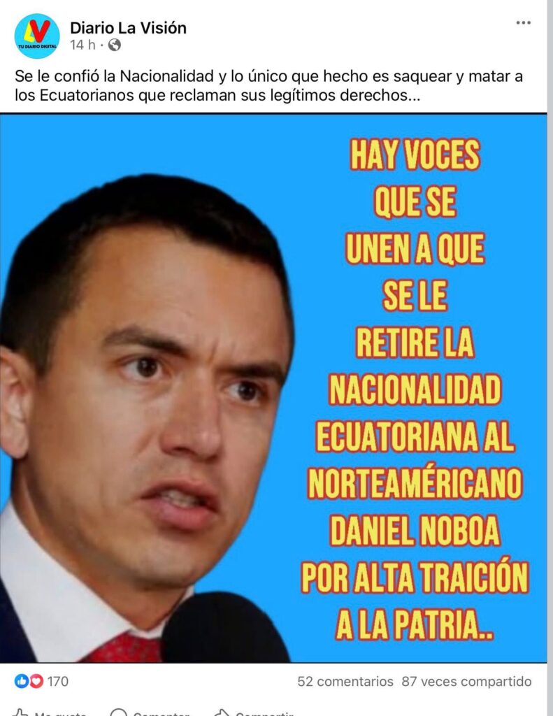 En Facebook, desde la cuenta Diario La Visión —que Ecuador Chequea ha identificado previamente como generadora de desinformación— circula una publicación que asegura que “hay voces que se unen para retirarle la nacionalidad ecuatoriana al norteamericano Daniel Noboa por traición a la patria”.