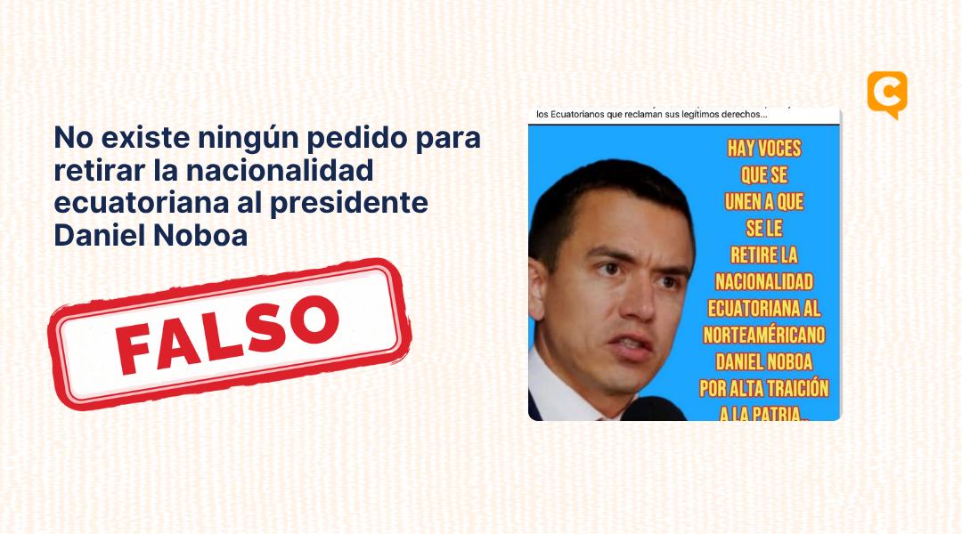 Es falso. No existe ningún pedido formal ni trámite legal para retirar la nacionalidad ecuatoriana al presidente Daniel Noboa. La Constitución prohíbe la revocatoria de la nacionalidad por nacimiento, y las autoridades competentes —como el Registro Civil, el CNE y la Presidencia— no reportan gestiones de ese tipo.