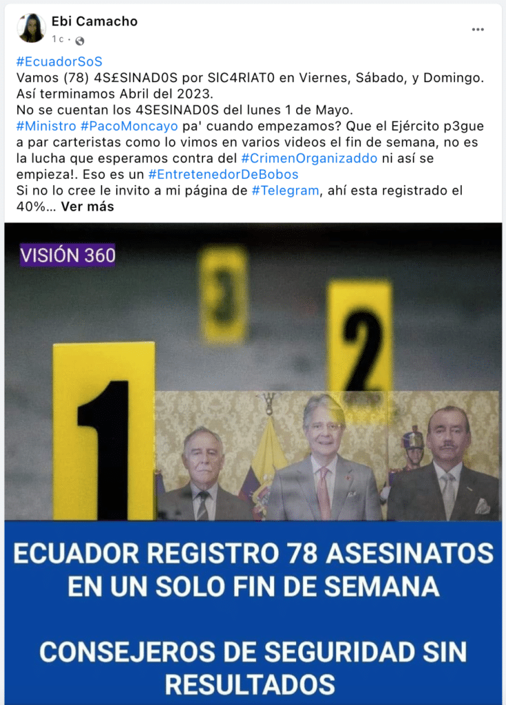 En una publicación que circula en Facebook se asegura que en Ecuador se registraron 78 asesinados durante el último fin de semana, tomando en cuenta el viernes, sábado y domingo. Esta información es inverificable. Desde este medio se realizaron varias búsquedas y pedidos de información para conocer las cifras oficiales por parte de las instituciones del Estado, pero hasta la publicación de esta nota no recibimos dichas estadísticas.