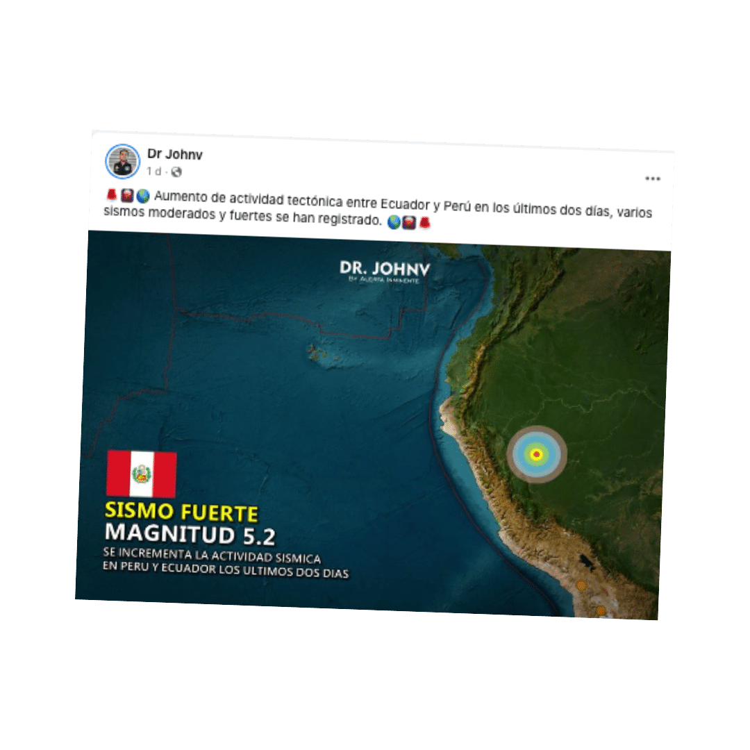 Un ejemplo claro es la publicación que circula en Facebook y asegura que la actividad tectónica entre Perú y Ecuador aumentó y se han presentado sismos fuertes. Esta información es falsa. Consultamos con un experto del Instituto Geofísico y desmintió la publicación. Sin embargo, si se leen los comentarios de los usuarios, es evidente que los desinformadores cumplen su cometido, porque incluso se comienza a preguntar por la posibilidad de sismos nuevos en esta zona, cuando no existe forma científica de predecir sismos.
