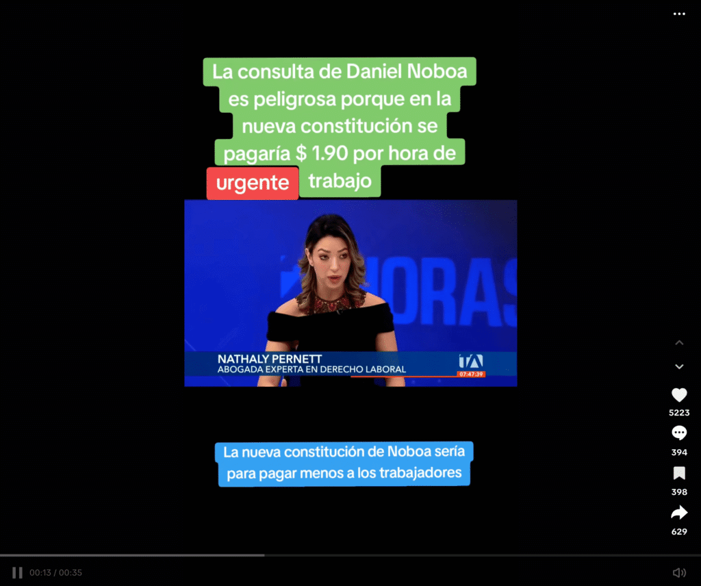 En TikTok circula un video en el que se asegura que la nueva Constitución que plantea Daniel Noboa es peligrosa porque incluiría el trabajo por hora con un pago de USD 1,90. El video fue publicado por la cuenta flashinformativo_ec, que tiene más de 386 mil seguidores y suele difundir contenido sobre política nacional, especialmente durante el periodo de campaña de la consulta popular 2025.