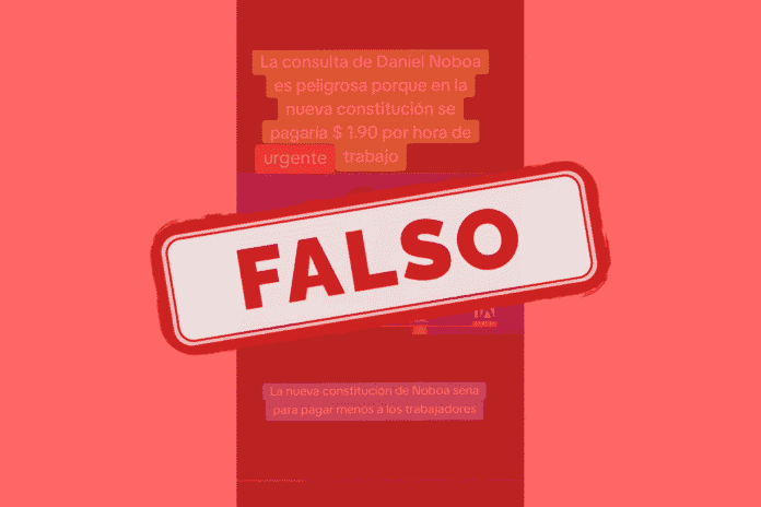 - Lo que afirma: “En la nueva Constitución que plantea Daniel Noboa se establecerá el trabajo por hora y se pagará 1,90 dólares por hora.”