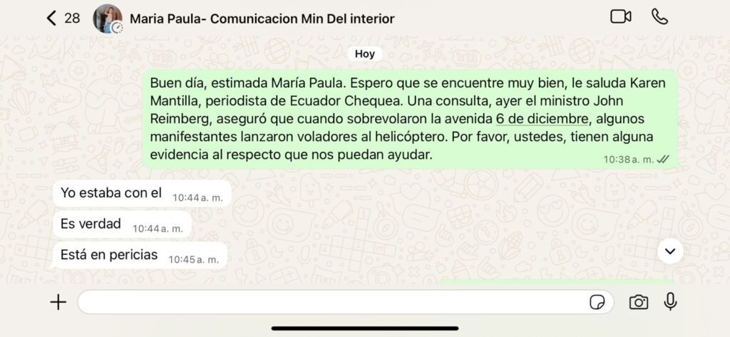 El ministro del Interior, John Reimberg, declaró que mientras sobrevolaba el sector de la avenida Seis de Diciembre, durante las protestas del 12 de octubre, los manifestantes “lanzaron voladores hacia el helicóptero”.
