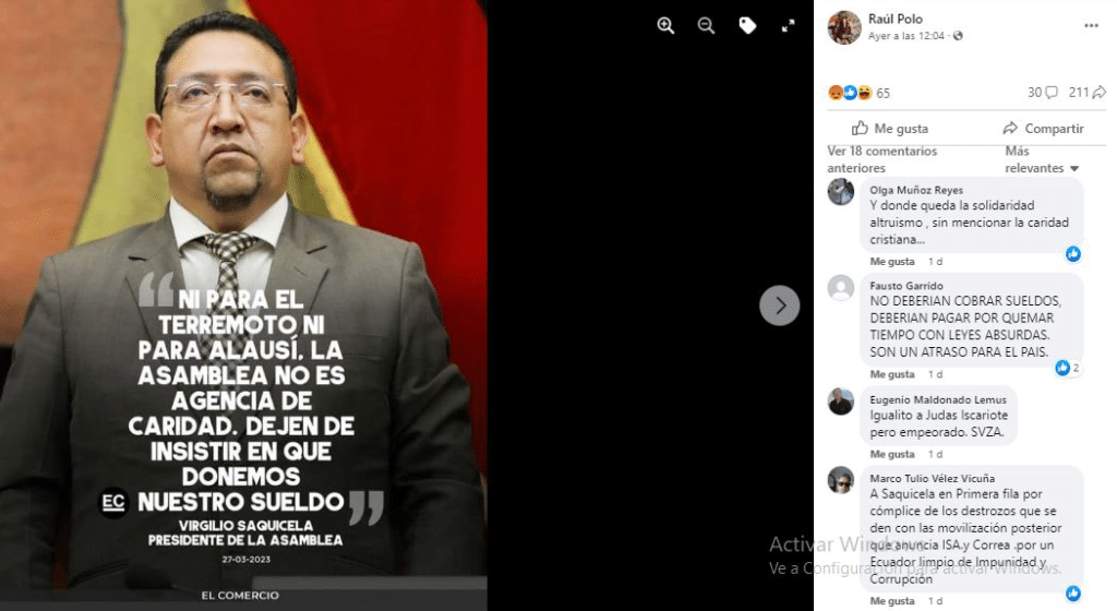 En Facebook se publicó un contenido que afirma que el presidente de la Asamblea Nacional, Virgilio Saquicela, habría declarado: “Ni para el terremoto ni para Alausí, la Asamblea no es agencia de caridad. Dejen de insistir en que donemos nuestro sueldo”. Calificamos este contenido como falso, pues no existe registro de las supuestas declaraciones de Saquicela y el diario El Comercio, al que se atribuye el supuesto post, tampoco ha publicado nada al respecto.