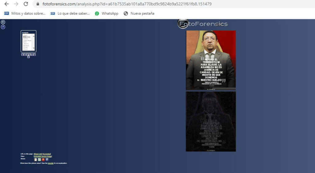 La imagen con las supuestas declaraciones del legislador fue sometida a la herramienta de Fotoforensics para determinar si la foto fue editada o no. Los resultados que se obtuvieron en la imagen con la capa negra tipo negativo fueron que las siluetas se observan de manera leve, por lo tanto, es una imagen manipulada.