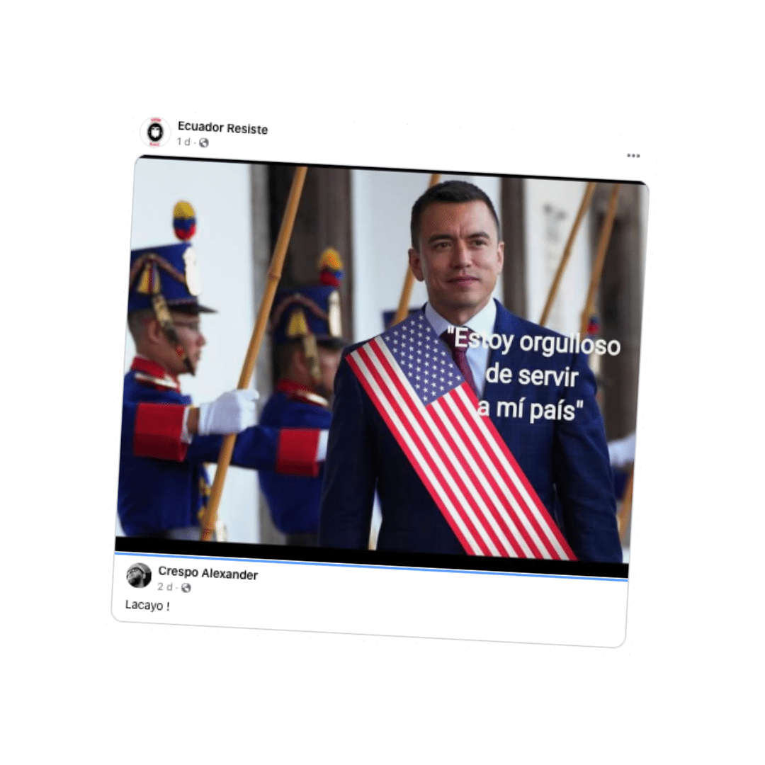 El apoyo del país norteramericano en medio del conflicto armado interno, ha generado distintos tipos de contenidos en redes sociales. En Facebook circula una publicación que asegura que el presidente, Daniel Noboa, habría dicho: “Estoy orgulloso de servir a mi país”. En la fotografía del post se observa al Primer Mandatario con lo que parece ser una banda de Estados Unidos. Se califica este contenido falso. No hay registro de que Noboa haya dicho lo que se le atribuye. Además, la imagen está editada. La fotografía original fue captada el 17 de octubre del 2023, cuando Noboa se reunió con el expresidente Lasso para el proceso de transición.