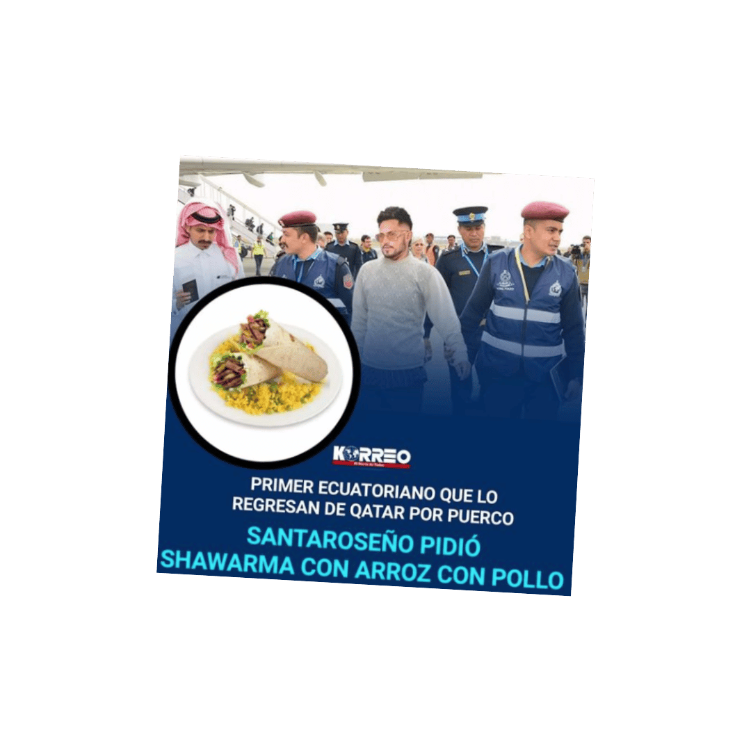 En una publicación de Facebook se asegura que un ecuatoriano fue deportado de Catar después de pedir en un restaurante ‘’shawarma con arroz con pollo”. No hay registros de que algún ciudadano haya sido expulsado por ese motivo de ese país árabe. Asimismo, la foto que se usa en el post sale de un contenido satírico en el que se aseguró que, supuestamente, un cantante venezolano fue detenido por intentar cantar en la inauguración del Mundial. Es decir, esta información es satírica.