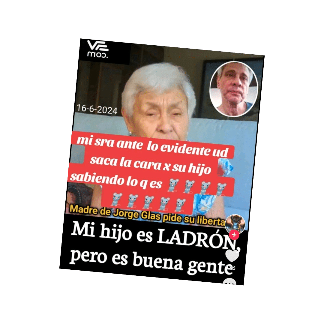 Por ejemplo, un video que circula en TikTok asegura que la madre del exvicepresidente, Jorge Glas, dijo: “Mi hijo es ladrón, pero buena gente”. Se califica este contenido como falso. No hay registro de que la madre del exvicrpresidente haya dicho la declaración que se le atribuye.