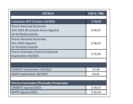 Según el reporte de Petroecuador del martes 14 de octubre, el precio promedio del WTI (referencial del crudo ecuatoriano) se ubica en USD 58,90 por barril, mientras que el precio nacional promedio de enero a agosto fue de USD 60,57.