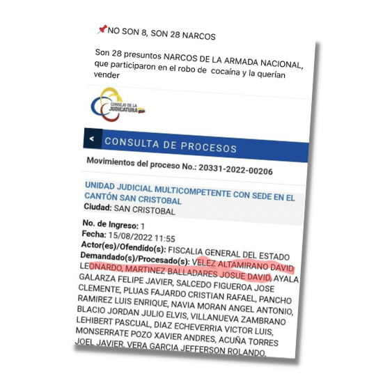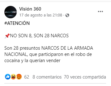 En la red social Facebook circula una imagen que afirma: “No son 8, son 28 presuntos narcos de la Armada Nacional, que participaron en el robo de cocaína y la querían vender”. Esta información es falsa.
