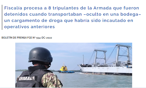 Son ocho los miembros de la Armada ecuatoriana procesados por la Fiscalía, luego de que se presume que intentaron comercializar cocaína que había sido incautada el pasado 11 de agosto, en Galápagos. Los procesados transportaban la droga en una lancha guardacostas.