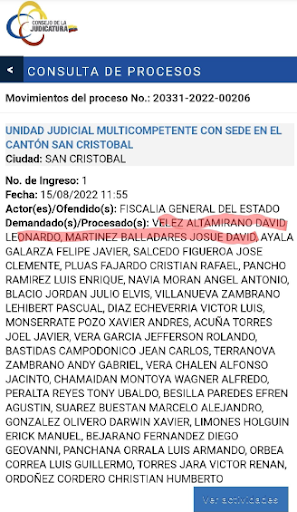 Ecuador Chequea realizó una búsqueda por el Sistema Informático de Trámite Judicial (Satje), que registra y permite realizar un seguimiento de las actividades realizadas en cada una de las causas que se llevan a cabo en las diferentes Judicaturas. La lista de nombres que está en la imagen no corresponde a ninguno de los 8 procesados. De todos ellos, algunos tienen procesos de desestimación, divorcios, y en la gran mayoría no se encuentran resultados.