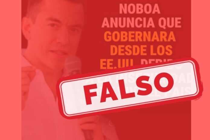- Qué se dijo o qué circula: La publicación atribuye a Noboa un anuncio: que “gobernará desde EE. UU.” y que lo hace “debido a la inseguridad”.