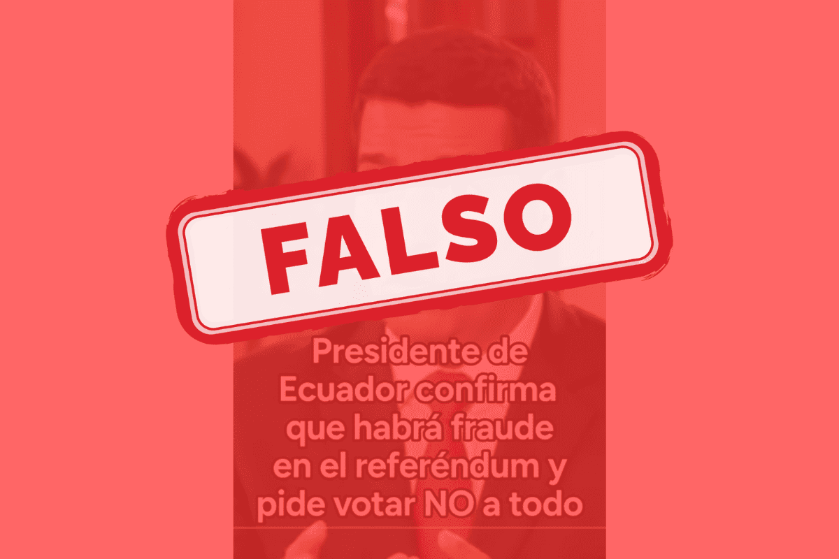 - Qué verificamos: Un video difundido en TikTok donde un hombre, que aparenta ser periodista o político, asegura que el presidente Daniel Noboa reconoció un supuesto fraude en la consulta popular y pidió votar “NO” en todas las preguntas.