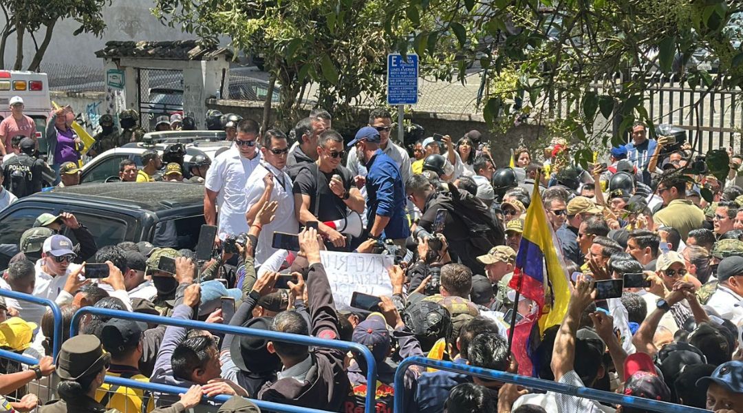Noboa llegó una hora tarde a la concentración, frente a la Caja del Seguro. Lo hizo en su caravana motorizada, vehículos de alta gama, blindados y motos, que se abrieron paso fácilmente entre la multitud hasta ubicarse en el centro del anillo de seguridad que a un par de metros a la redonda formó una hora antes personal especializado, ya sean militares, policías o personal de civil.