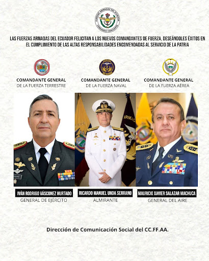 El nuevo comandante del Ejército, el general Iván Rodrigo Vásconez Hurtado, tiene un título de licenciado en Cultura Física y en Ciencias Militares y experiencia como comandante del Comando de Operaciones Terrestres e inspector General de la Fuerza Terrestre, jefe de la Casa Militar Presidencial, director de Movilización, director de la Academia de Guerra, director de la Escuela de Formación de Soldados, asesor de la Subsecretaría de Defensa del Ministerio de Defensa, y, agregado de Defensa en Bolivia.