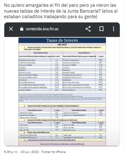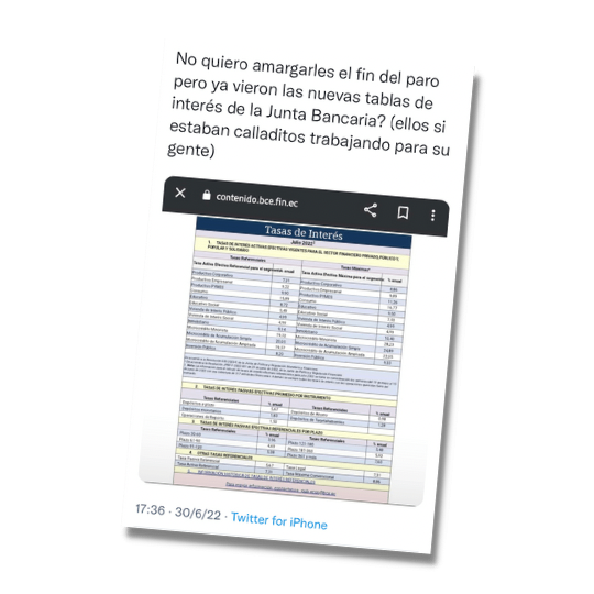 Una publicación en Twitter menciona: “No quiero amargarles el fin del paro, pero ¿ya vieron las nuevas tablas de interés de la Junta Bancaria? Ellos estaban calladitos trabajando para su gente”. La información es engañosa, porque, aunque las nuevas tasas son reales, las manifestaciones a nivel nacional no influenciaron en el porcentaje fijado.