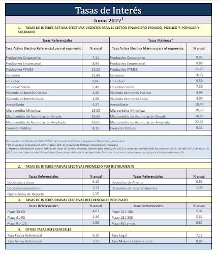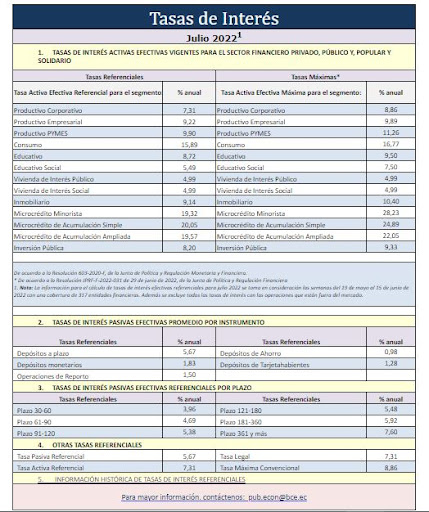 El Banco Central publicó las tasas de interés vigentes para el sector financiero privado, público y popular y solidario para julio del 2022. Si comparamos con las tasas que se fijaron en junio de 2022, sí existe un ligero incremento. Sin embargo, los expertos aseguran que las tasas de interés no han variado en el país desde hace mucho tiempo, o sus variaciones son muy pequeñas.
