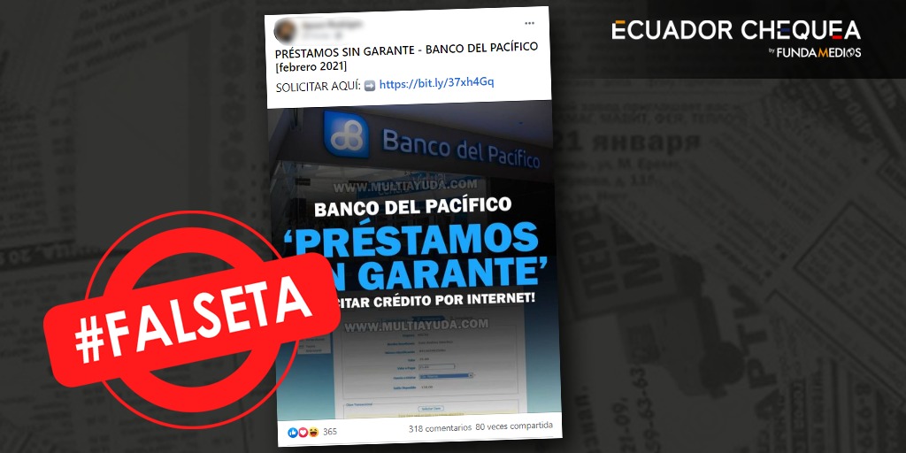 En Facebook se ha difundido información falsa sobre supuestos “prestamos sin garantes” que otorga el Banco del Pacífico, en las que el usuario únicamente debe tramitarlos por internet.