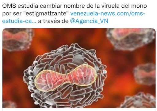 En Twitter se publicó un contenido que asegura que la Organización Mundial de la Salud (OMS) estudia cambiar el nombre de la viruela del mono por ser «estigmatizante». La publicación añade un enlace en el que se menciona que el nombre actual de la viruela del mono podría ser discriminatoria. La información es cierta.