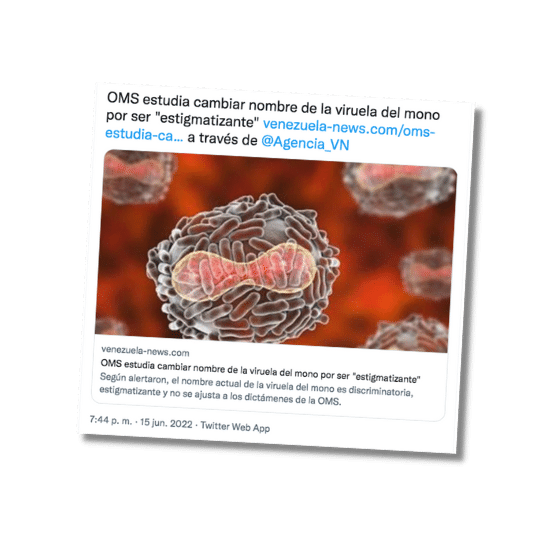 En Twitter se publicó un contenido que asegura que la Organización Mundial de la Salud (OMS) estudia cambiar el nombre de la viruela del mono por ser «estigmatizante». La publicación añade un enlace en el que se menciona que el nombre actual de la viruela del mono podría ser discriminatoria. La información es cierta.
