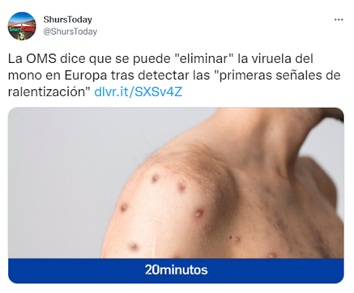 En Twitter circula una imagen que asegura que la OMS dice que se puede «eliminar» la viruela del mono en Europa tras detectar las «primeras señales de ralentización». Está información es cierta.