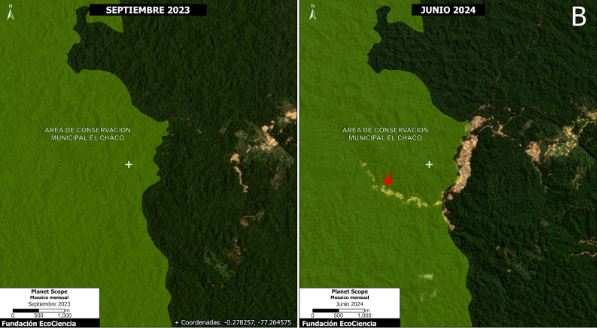 El Chaco es un cantón amazónico casi en la otra punta de Palanda. Su índice de transparencia en 2023 fue de 3/20. Entre 2013 la agricultura creció en 1500% y la minería en más del 5000%. El Chaco está en Napo. Al igual que Palanda, está en la zona de amortiguamiento de un Parque Nacional. Además, como Municipio, administra un bosque protector. El 95% de su territorio está dentro de áreas de conservación. Sin embargo, de acuerdo con estudios con imágenes satelitales de Monitorean of Andean Amazon Project (MAAP) sólo entre septiembre de 2023 y junio de 2024 se deforestaron 144 hectáreas dentro del Área de Conservación Municipal de El Chaco por la expansión minera. También se detectaron 91 kilómetros de carreteras posiblemente ilegales. Solicitamos información al mail que encontramos en la página web del cantón El Chaco, pero, hasta el cierre de esta investigación, no obtuvimos respuesta.
